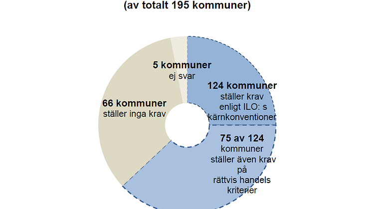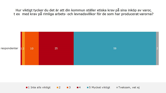Enligt en egen undersökning som Fairtrade har gjort ställer idag 63 procent av svarande kommuner krav på ILOs kärnkonventioner och 38 procent ställer dessutom krav enligt principer för rättvis handel. 33 procent ställer inga krav alls och den främsta anledning som angavs var resursbrist.