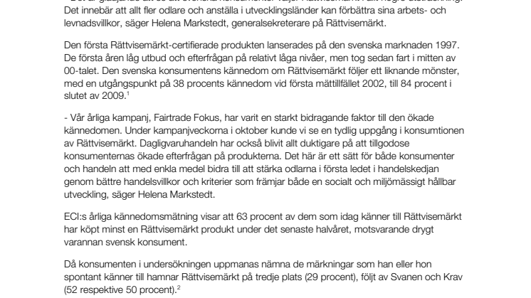 - Det är glädjande att se att svenska konsumenter väljer Rättvisemärkt i allt högre utsträckning. Det innebär att allt fler odlare och anställa i utvecklingsländer kan förbättra sina arbets- och levnadsvillkor, säger Helena Markstedt, generalsekreterare på Rättvisemärkt.