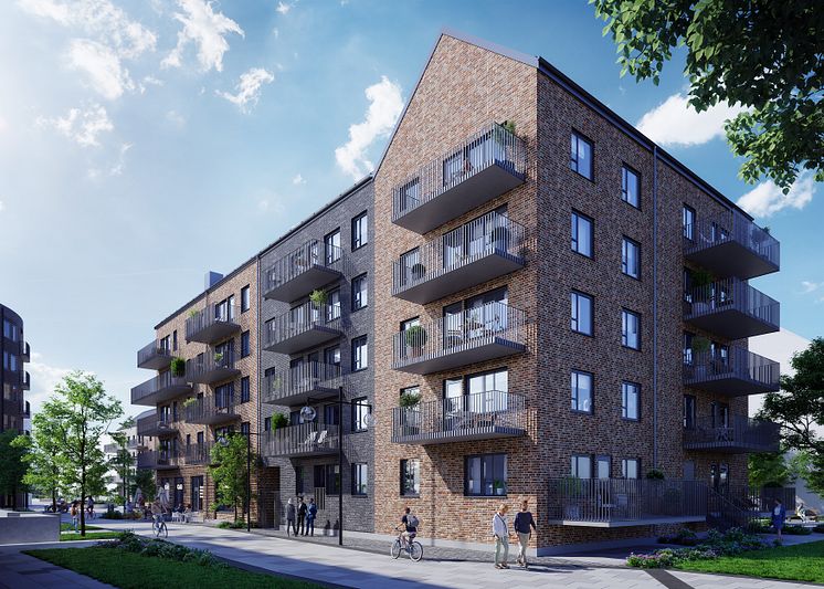 Ett av Familjebostäders jubileumshus vid Selma Lagerlöfs Torg