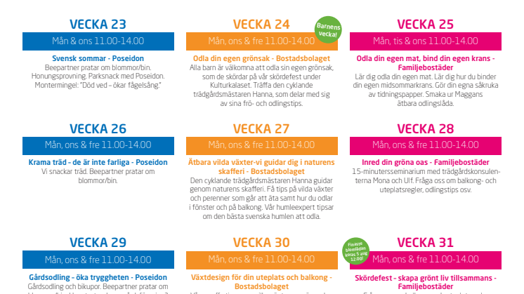 Här bjuder vi förutom på odlingsinspiration och kransbindningstips även på honung, vegetariska recept och mycket annat. Varje vecka i vår popup-park kommer med ett nytt tema som exempelvis cyklande trädgårdsmästaren, krama träd och inred din gröna oas.