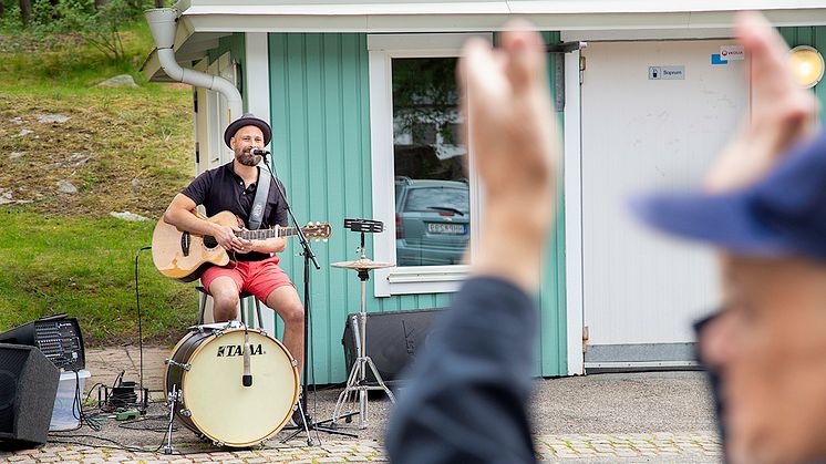 Våra äldre hyresgäster fick ta del av livemusik i solsken, när Kultur till Kvarteret kom på besök till trygghetsboendena på Kalendervägen i Kortedala.