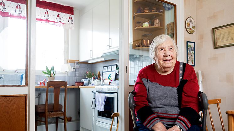 Här bor hon kvar eftersom hon trivs så bra. När det var dags för stambyte för ett antal år sedan flyttade hon till en likadan lägenhet i andra sidan av huset.