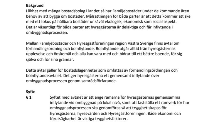 Familjebostäder, Bostadsbolaget och Poseidon har tillsammans med Hyresgästföreningen tagit fram avtalet. Förvaltnings AB Framtiden, i vilket bolagen ingår, äger och förvaltar cirka 70 000 lägenheter. Behovet av renovering finns hela tiden någonstans. Allt från byte av fönster, renovering av tak och väggar till mer omfattande åtgärder som påverkar våra boende både praktiskt under åtgärdstiden och ekonomiskt i form av höjd hyra.