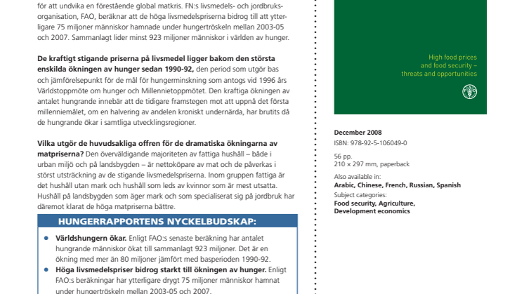 "De globala matpriserna har minskat sedan årets början, men lägre priser har inte minskat matkrisen i många fattiga länder," framhåller Hafez Ghanem, undergeneraldirektör i FAO, som idag presenterar årets Hungerrapport, kallad The State of Food Insecurity in the World 2008.