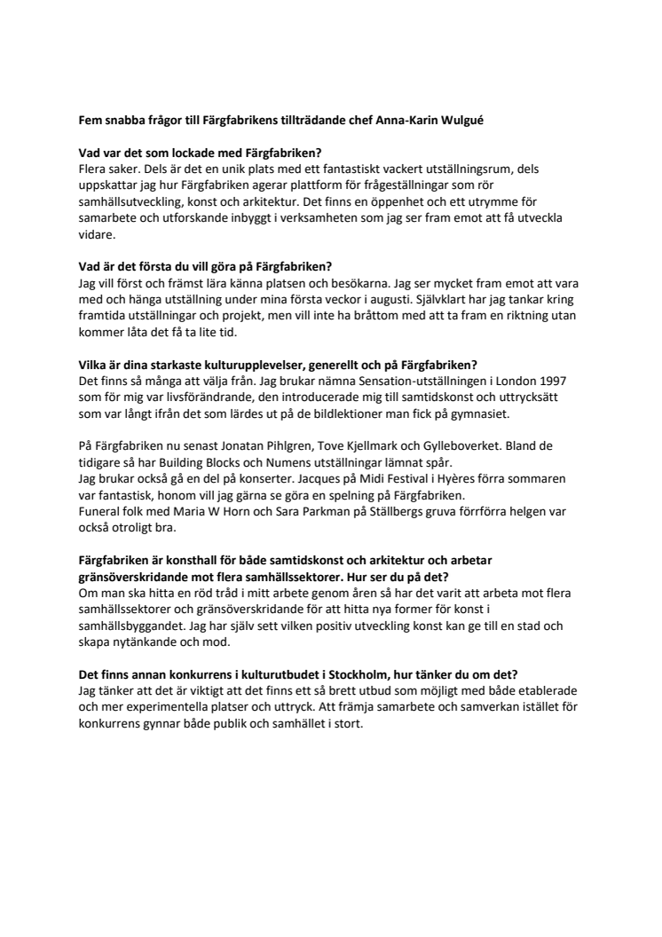 Färgfabrikens tillträdande chef Anna-Karin Wulgué svarar på fem snabba frågor. Materialet är fritt att publicera.