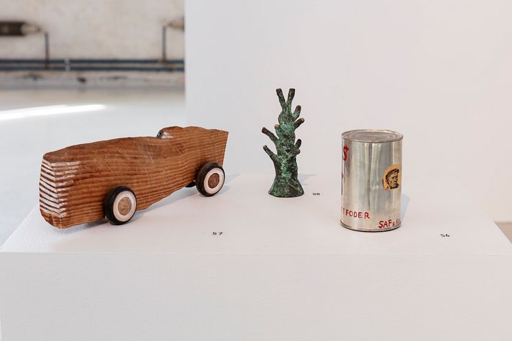 fr.v. Självporträtt som bil, 1985, Det gråtande trädet, fontänskiss Eksjö, 1998 & Konservburk, 1974, Åke Pallarp, Upprymd, Färgfabriken 2022. Foto av Johan Österholm
