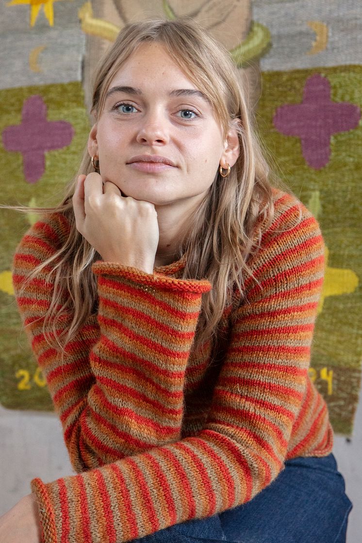 Porträtt av Lisa Englund framför väven Jocke och Anna, 2024.