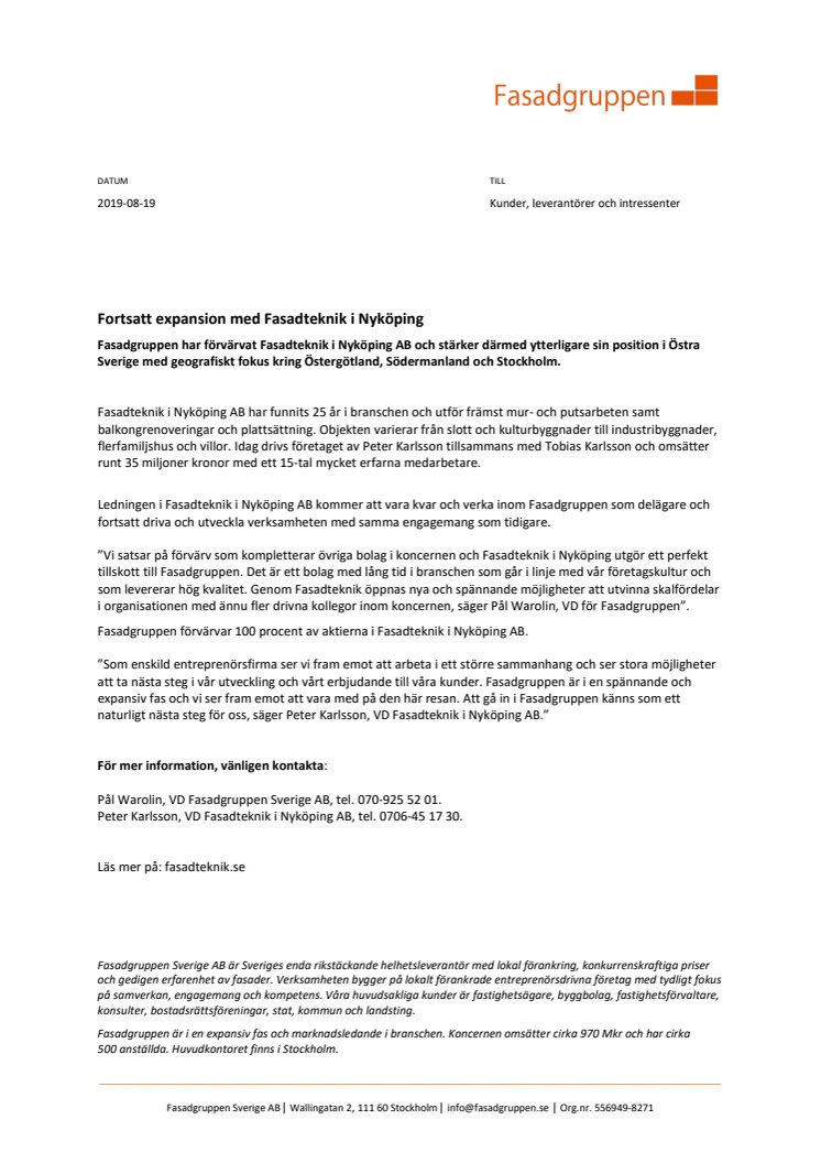 Fasadgruppen har förvärvat Fasadteknik i Nyköping AB och stärker därmed ytterligare sin position i Östra Sverige med geografiskt fokus kring Östergötland, Södermanland och Stockholm.