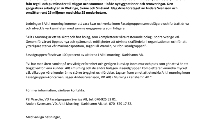 ”Allt i Murning är ett välskött och fint bolag, som kompletterar våra resterande bolag i södra Sverige väl. Genom förvärvet öppnas nya och spännande möjligheter att utvinna skalfördelar i organisationen och för att ytterligare stärka vår marknadsposition, säger Pål Warolin, VD för Fasadgruppen”.