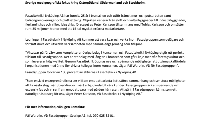 Fasadgruppen förvärvar 100 procent av aktierna i Fasadteknik i Nyköping AB.