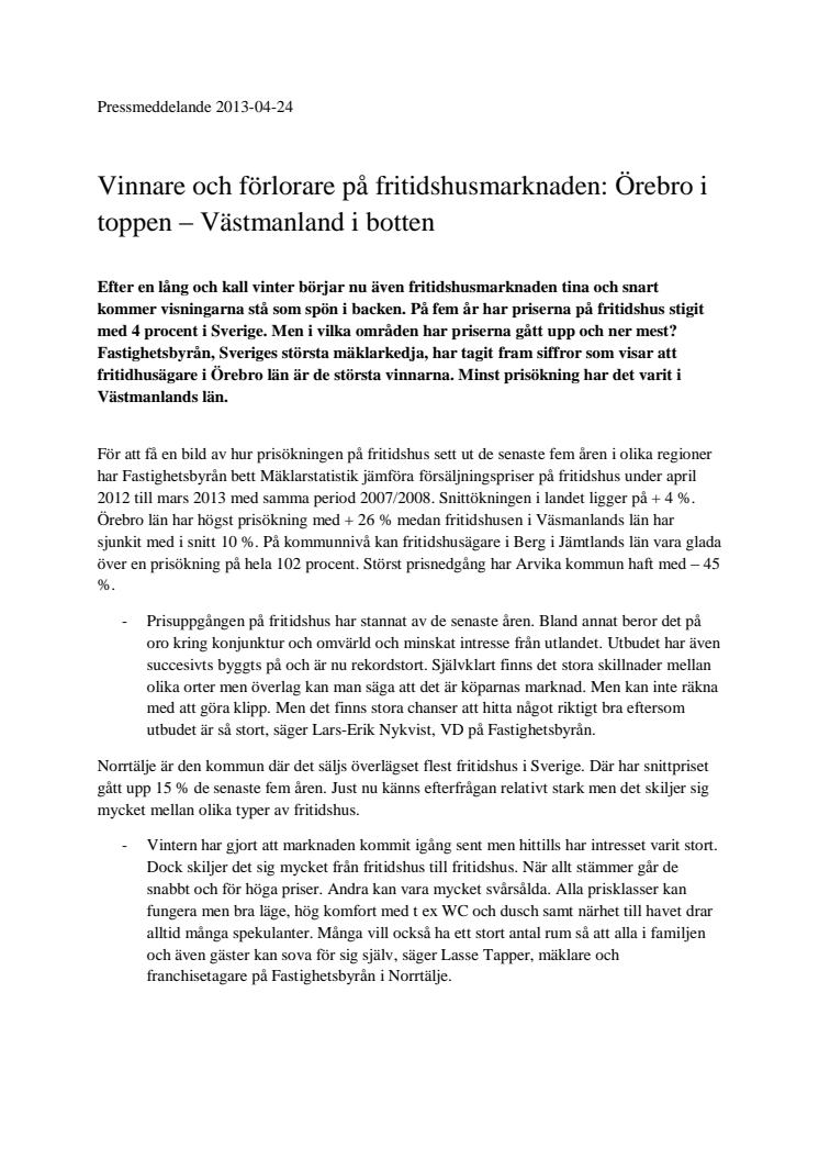 På fem år har priserna på fritidshus stigit med 4 procent i Sverige. Men i vilka områden har priserna gått upp och ner mest? Fastighetsbyrån, Sveriges största mäklarkedja, har tagit fram siffror som visar att fritidhusägare i Örebro län är de största vinnarna. Minst prisökning har det varit i Västmanlands län.