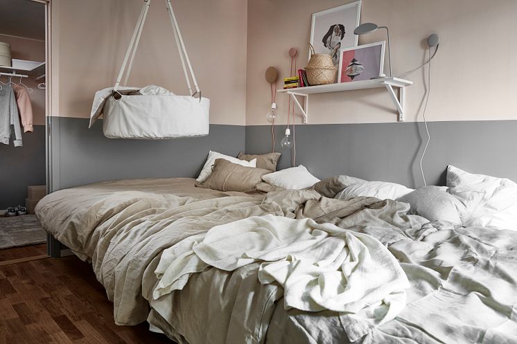 Här bor en familj med två barn och ytor för lek och aktivitet är centralt. Korkväggen i hallen fungerar som ett kommunikationsverktyg. Matplatsen är skapad som en plats där familjen kan umgås. Problematiken med lite plats för återvinning har lösts genom en platsbyggd möbel på bostadens stora balkong! Och vem vill inte ha en säng där hela familjen får gott om plats?