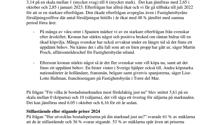På frågan ”Hur stark är efterfrågan från svenska köpare på din marknad just nu?” blev snittet 3,14 på en skala mellan 1 (mycket svag) till 6 (mycket stark). Det kan jämföras med 2,65 i oktober och 2,85 i januari 2023. Efterfrågan har alltså ökat och vi får gå tillbaka till juli 2022 för att se en starkare efterfrågan. Den ökade efterfrågan avspeglas även i Fastighetsbyråns försäljningssiffror där antal försäljningar hittills i år ökat med 48 % jämfört med samma period förra året.