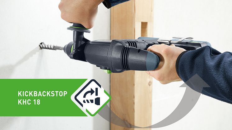 Tack vare den den smarta utsugsanordningen (finns som tillbehör), som fästs på djupanslaget och ansluts till dammsugaren, kan du arbeta så gott som dammfritt. Bluetooth®-batteriet kommunicerar med Bluetooth®-modulen i Festools dammsugare så att dammsugaren startar automatiskt när kombihammaren startas. En annan säkerhetsdetalj är den elektroniska KickbackStop-funktionen som motverkar en farlig vridning i handleden om borret plötsligt skulle fastna. KHC 18 tar dessutom upp slagenergin och dämpar den innan den når händerna, vilket minskar vibrationerna.