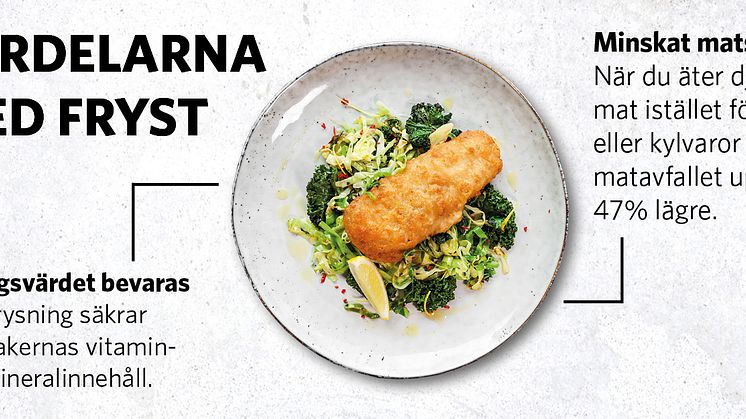 Fryst mat minskar dessutom matsvinnet med upp till 47% jämför med färska alternativ. Med fryst är det nämligen enkelt att ta tillvara all mat i förpackningen. Genom att plocka fram precis den mängd som behövs och låta resten ligga kvar i frysen blir det inget spill. Helt enkelt; fryst mat är klimatsmart!