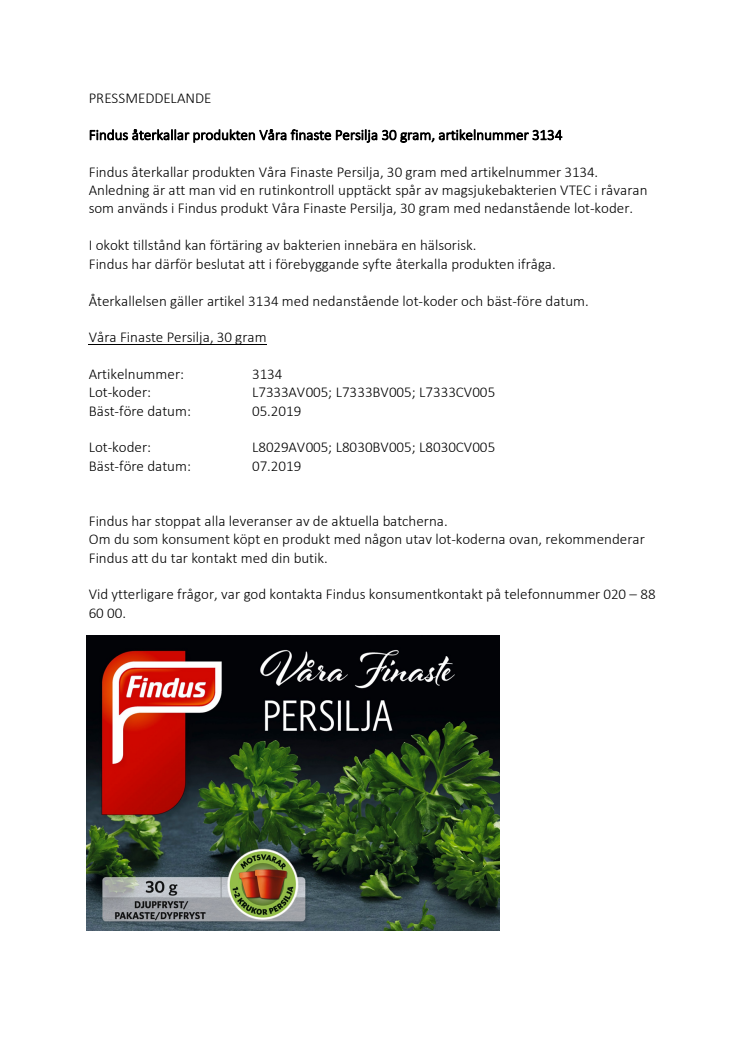 Anledning är att man vid en rutinkontroll upptäckt spår av magsjukebakterien VTEC i råvaran som används i Findus produkt Våra Finaste Persilja, 30 gram med nedanstående lot-koder.
