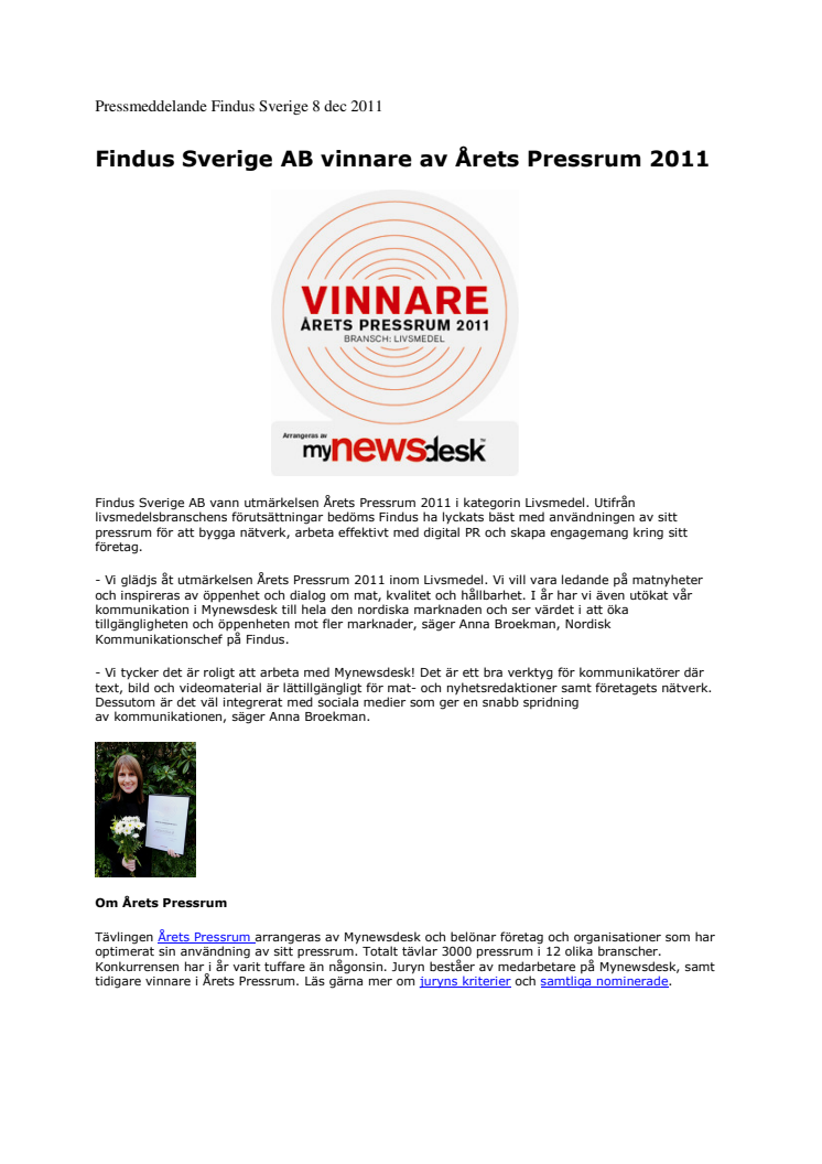 Findus Sverige AB vann utmärkelsen Årets Pressrum 2011 i kategorin Livsmedel. Utifrån livsmedelsbranschens förutsättningar bedöms Findus ha lyckats bäst med användningen av sitt pressrum för att bygga nätverk, arbeta effektivt med digital PR och skapa engagemang kring sitt företag.