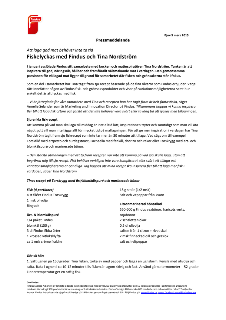 Att laga god mat behöver inte ta tid. Det bevisar Findus i sin senaste kampanj Fiskelyckas. I januari avslöjade Findus sitt samarbete med kocken och matinspiratören Tina Nordström. Tanken är att inspirera till god, näringsrik, hållbar och framförallt välsmakande mat i vardagen. Den gemensamma passionen för vällagad mat ligger till grund för samarbetet där fisken och grönsakerna står i fokus.