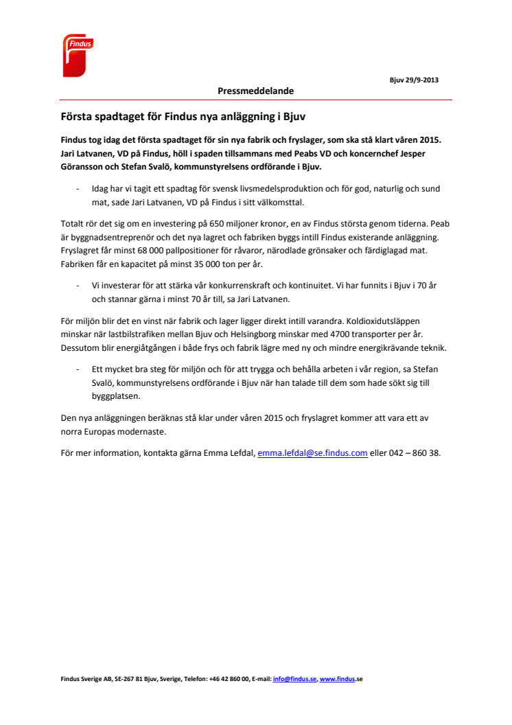 Findus tog idag det första spadtaget för sin nya fabrik och fryslager, som ska stå klart våren 2015. Jari Latvanen, VD på Findus, höll i spaden tillsammans med Peabs VD och koncernchef Jesper Göransson och Stefan Svalö, kommunstyrelsens ordförande i Bjuv.