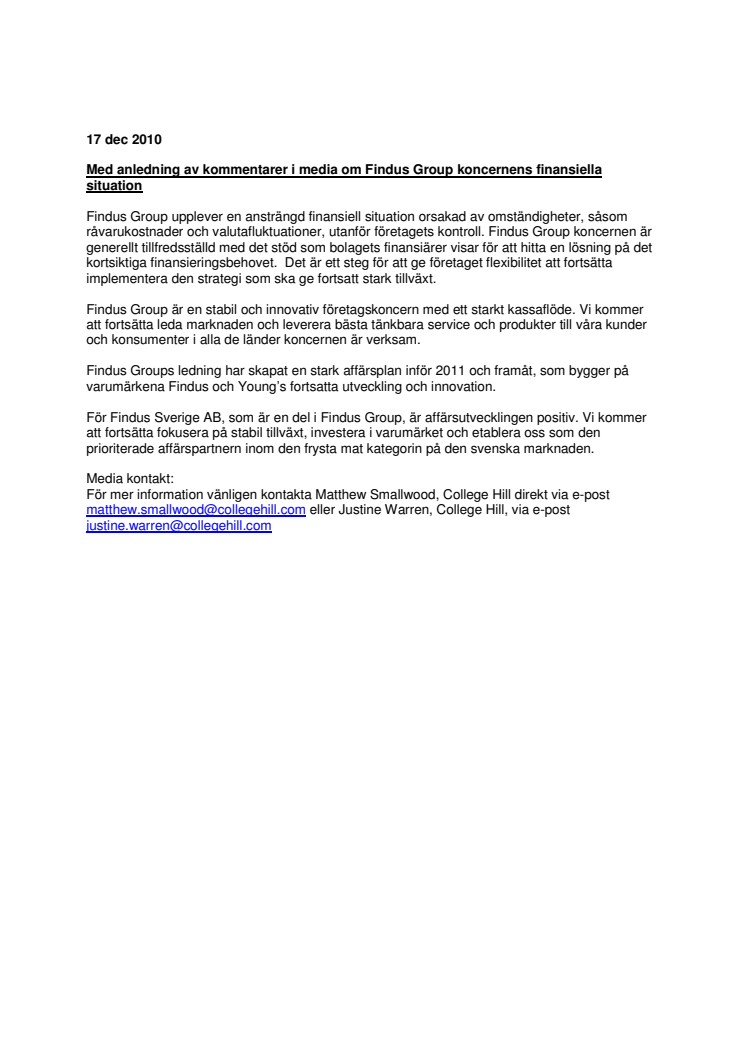 Med anledning av kommentarer i media om Findus Group koncernens finansiella situation