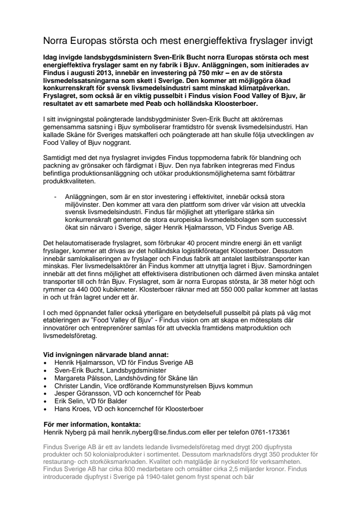 Idag invigde landsbygdsministern Sven-Erik Bucht norra Europas största och mest energieffektiva fryslager samt en ny fabrik i Bjuv. Anläggningen, som initierades av Findus i augusti 2013, innebär en investering på 750 mkr – en av de största livsmedelssatsningarna som skett i Sverige. Den kommer att möjliggöra ökad konkurrenskraft för svensk livsmedelsindustri samt minskad klimatpåverkan.