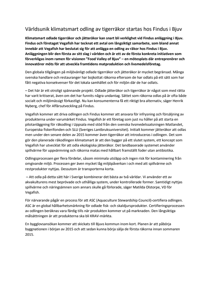 Klimatsmart odlade tigerräkor och jätteräkor kan snart bli verklighet vid Findus anläggning i Bjuv. Findus och företaget Vegafish har tecknat ett avtal om långsiktigt samarbete, som bland annat innebär att Vegafish har beslutat sig för att anlägga en odling av räkor hos Findus i Bjuv. Anläggningen blir den första av sitt slag i världen.