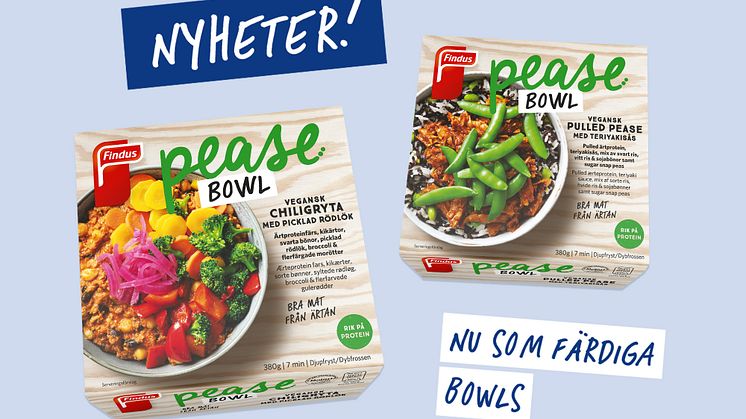 Under 2018 lanserade Findus sitt nya produktsortiment Pease – Bra mat från ärtan. Nu expanderar företaget utbudet av Pease ytterligare genom att lansera veganska färdigrätter där ärtproteinet Pease står i centrum. Pease Bowls kommer i två utföranden, en Chiligryta med picklad rödlök och Pulled Pease med teriyakisås. Pease Bowls tillagas i micro och är färdiga på bara 7-8 minuter.