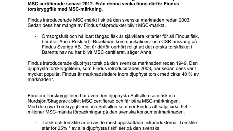 - Omsorgsfullt och hållbart fångad fisk är självklara kriterier för all Findus fisk, berättar Anna Roslund - Broekman kommunikations- och CSR ansvarig på Findus Sverige AB. Det är därför oerhört roligt att det norska torskfisket i Barents hav nu har blivit MSC certifierat, säger Anna.