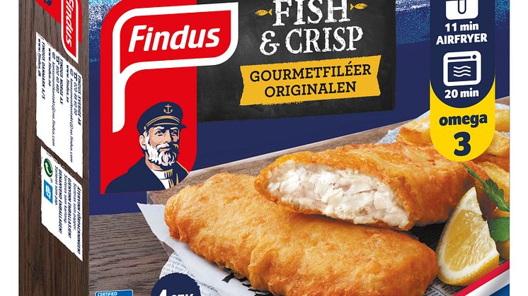 Populära Findus Fish & Crisp Gourmetfiléer är inspirerad av den brittiska klassikern fish’n chips och är en krispig, gyllene panerad fiskfilé av 100 procent hållbart fiskad Alaska pollock. Fish & Crisp är både smak- och näringsrik. Den är fullproppad med Omega 3 och passar perfekt att servera som en klassisk fish’n chips, i fisktacos eller med potatis, Findus Ebba ärtor och sås.