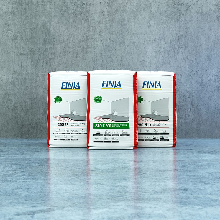 Nu byter Finja Betong förpackningarna på populära golvavjämningsmassorna Finja 310 F ECO, Finja 265 samt Finja 260 Fiber, från papper till plast. Plastsäckarna är slitstarka, fuktsäkra och återvinningsbara samt bidrar till en fördubblad hållbarhetstid.
