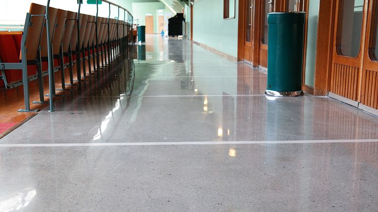 Arbetet, som utförts av Adamant Golvteknik, bestod av att slipa och polera betonggolven men först såga upp och därefter gjuta i spår i golvet. Allt för att komma så nära det ursprungliga golvets utseende, med två rader mosaik i spåren, som möjligt.