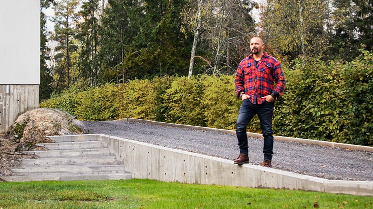 – Med en stödmur får jag en väldigt tydlig och snygg kant att följa när vi kör upp eller ner för uppfarten. Stödmuren formsattes på samma sätt som grunden på huset så muren kommer inte bara bli funktionell utan den kommer även smälta in bra med huset och dessutom bli väldigt vacker. Jag ville använda en betongsort som var mer beständig mot framförallt vägsalt och salt som normalt sett är frätande på betong och valet blev Finjas Reparationsbetong Anläggning Grov som har just den egenskapen, säger Björn Christiernsson.