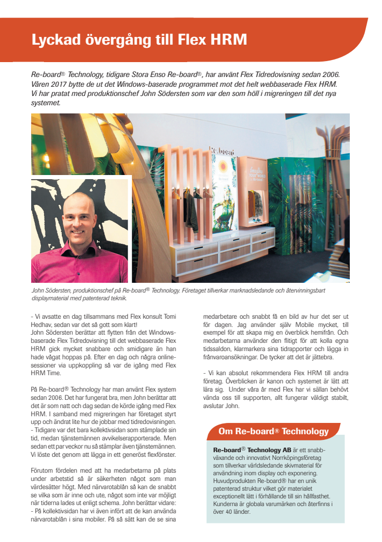Re-board® Technology, tidigare Stora Enso Re-board®, har använt Flex Tidredovisning sedan 2006. Våren 2017 bytte de ut det Windows-baserade programmet mot det helt webbaserade Flex HRM. Vi har pratat med produktionschef John Södersten som var den som höll i migreringen till det nya systemet.