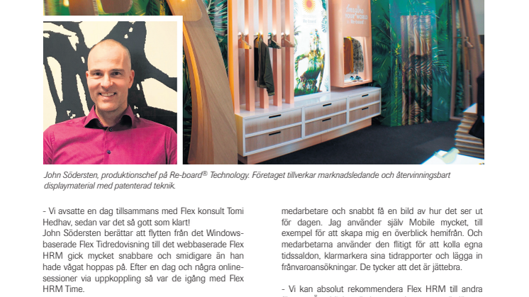 Re-board® Technology, tidigare Stora Enso Re-board®, har använt Flex Tidredovisning sedan 2006. Våren 2017 bytte de ut det Windows-baserade programmet mot det helt webbaserade Flex HRM. Vi har pratat med produktionschef John Södersten som var den som höll i migreringen till det nya systemet.