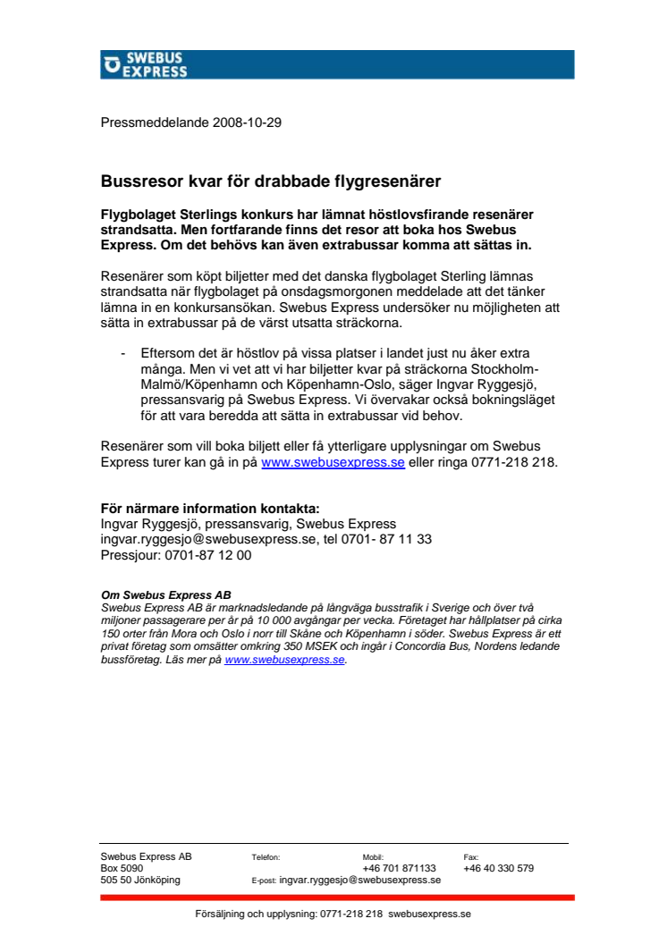 Flygbolaget Sterlings konkurs har lämnat höstlovsfirande resenärer strandsatta. Men fortfarande finns det resor att boka hos Swebus Express. Om det behövs kan även extrabussar komma att sättas in.