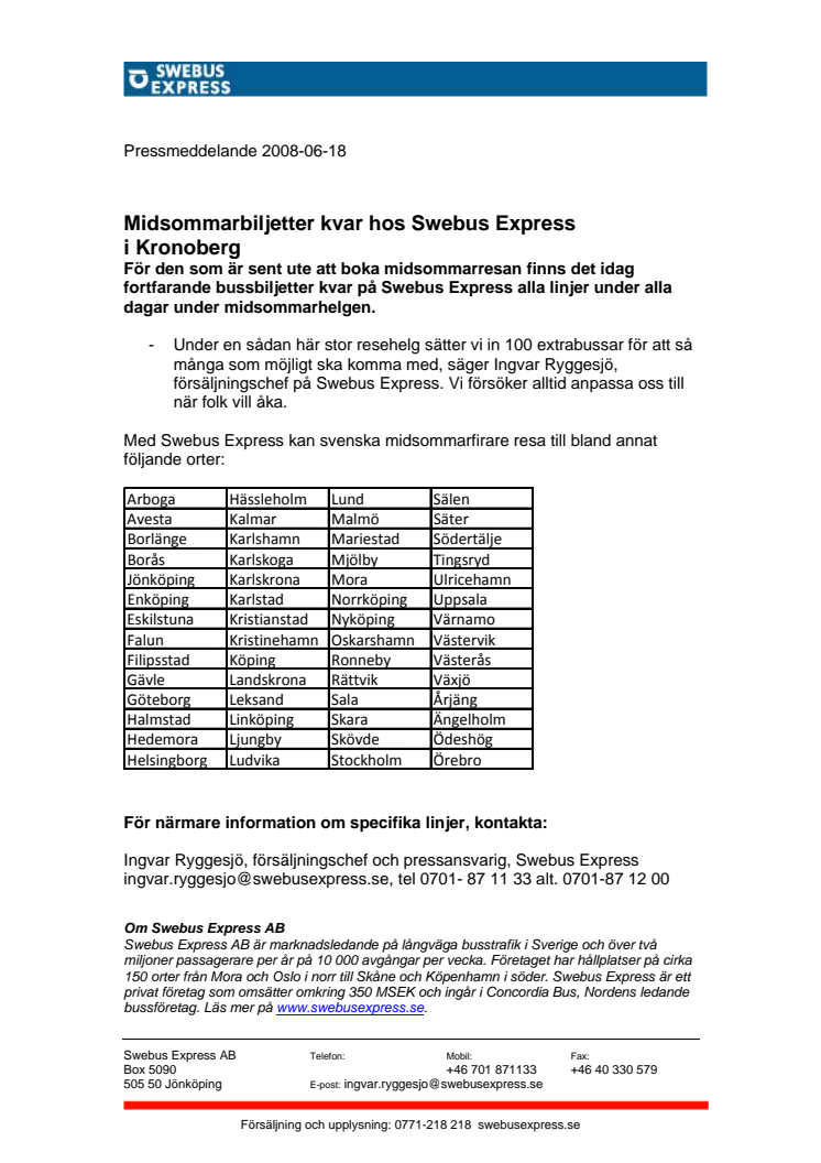 Midsommarbiljetter kvar hos Swebus Express i Kronoberg