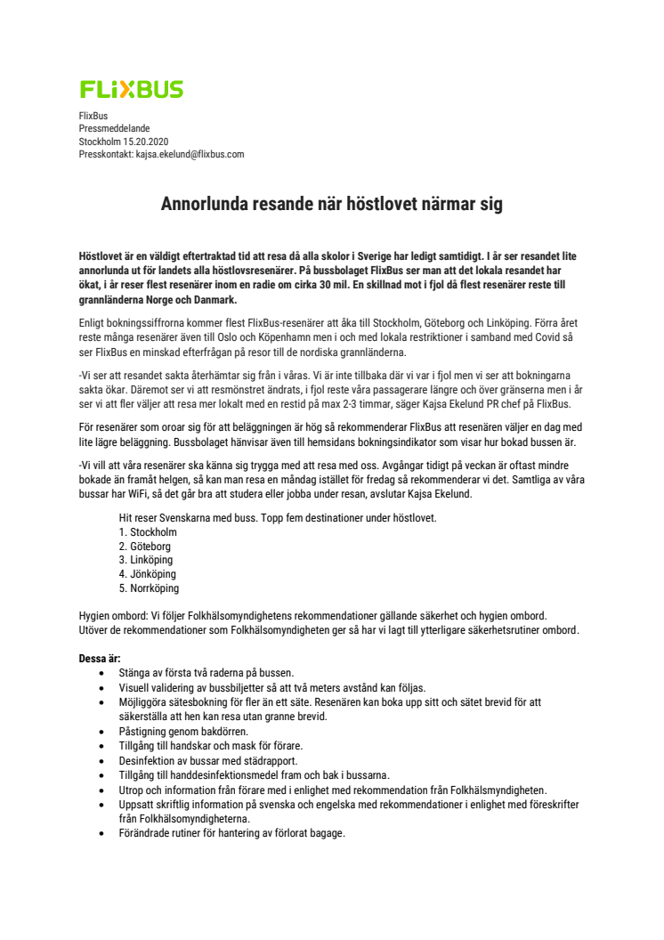 -Vi vill att våra resenärer ska känna sig trygga med att resa med oss. Avgångar tidigt på veckan är oftast mindre bokade än framåt helgen, så kan man resa en måndag istället för fredag så rekommenderar vi det. Samtliga av våra bussar har WiFi, så det går bra att studera eller jobba under resan, avslutar Kajsa Ekelund.