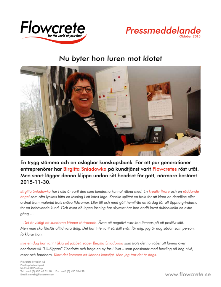 En trygg stämma och en oslagbar kunskapsbank. För ett par generationer entreprenörer har Birgitta Sniadowka på kundtjänst varit Flowcretes röst utåt. Men snart lägger denna klippa undan sitt headset för gott, närmare bestämt 2015-11-30.