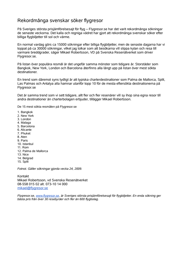 På Sveriges största prisjämförelsesajt för flyg – Flygresor.se har det varit rekordmånga sökningar de senaste veckorna. Det kalla och regniga vädret har gjort att rekordmånga svenskar söker efter billiga flygbiljetter till sol och värme.