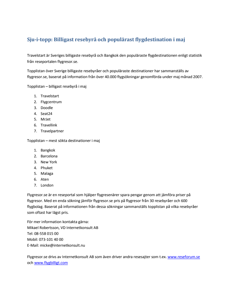 Topplistan över Sverige billigaste resebyråer och populäraste destinationer har sammanställs av flygresor.se, baserat på information från över 40.000 flygsökningar genomförda under maj månad 2007.