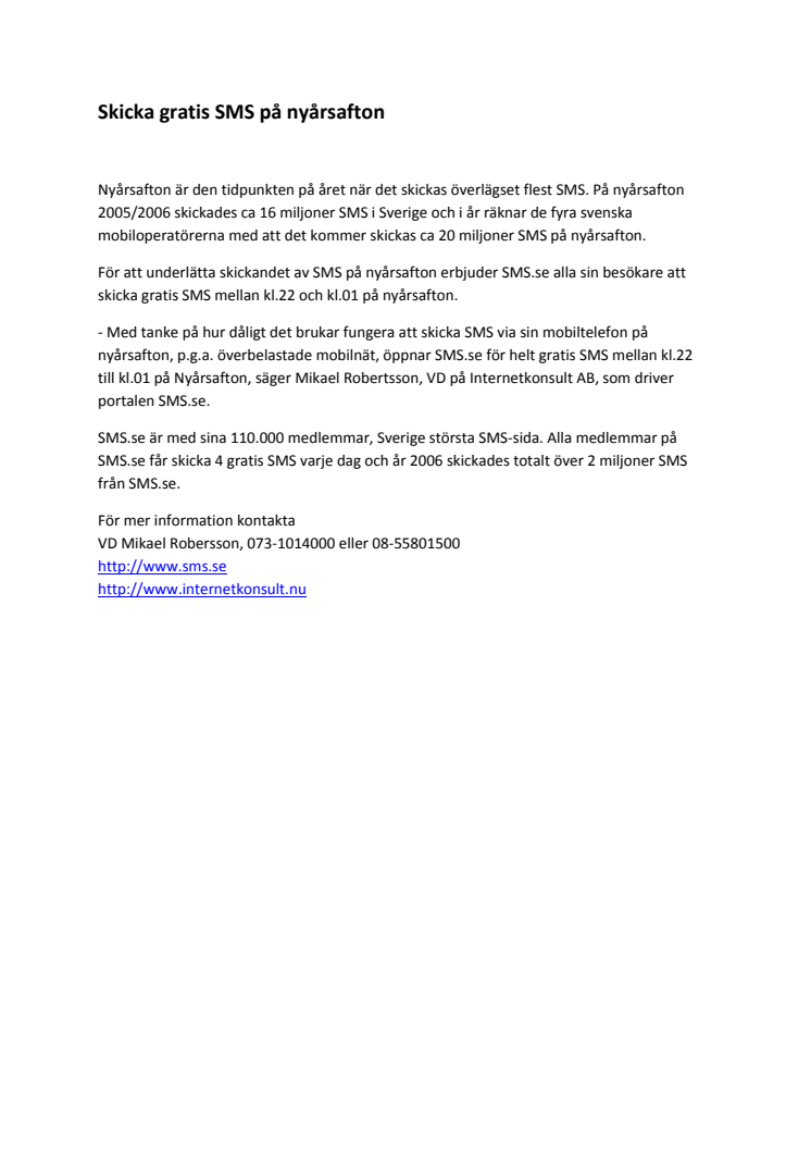 För att underlätta skickandet av SMS på nyårsafton erbjuder SMS.se alla sin besökare att skicka gratis SMS mellan kl.22 och kl.01 på nyårsafton.