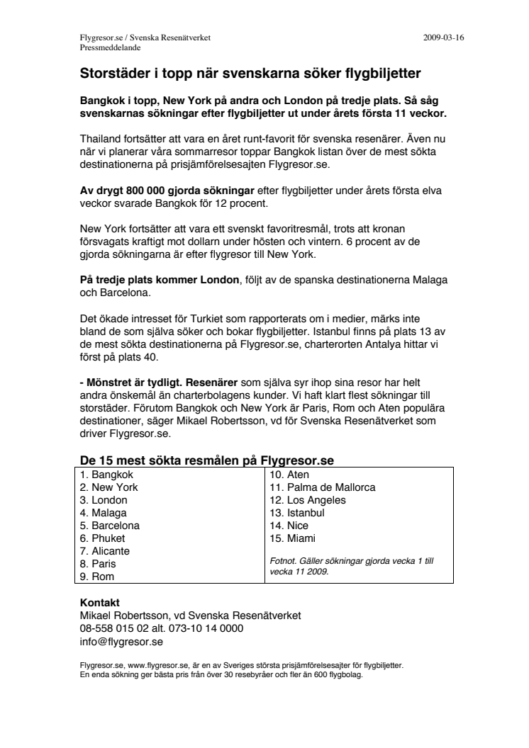 Bangkok i topp, New York på andra och London på tredje plats. Så såg svenskarnas sökningar efter flygbiljetter ut under årets första 11 veckor.