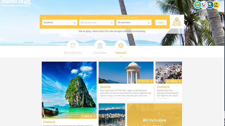 På Charter.se är det möjligt att hitta alla ledande charterarrangörers resor uppdelade på resmål, via karta eller ta del av deras sista minuten-erbjudanden. Enkla filter gör det möjligt att sortera ut resor beroende på pris, hotellets läge, utbudet på hotellet, all inclusive eller andra krav från resenärerna.