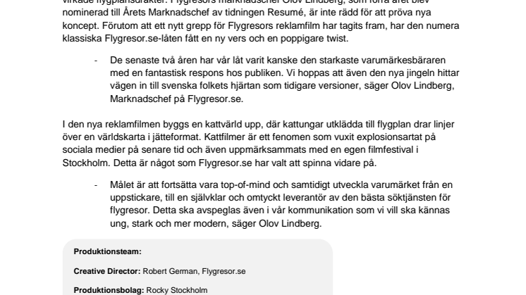 Flygresor.se, Sveriges största prisjämförelsesajt för flygresor, bryter ny mark inom tv-reklam och satsar på en kattfilm. I den nya reklamfilmen är ”filmstjärnorna” kattungar i virkade flygplansdräkter som guidar tittarna till Flygresor.se. Reklamfilmen hade premiär igår.
