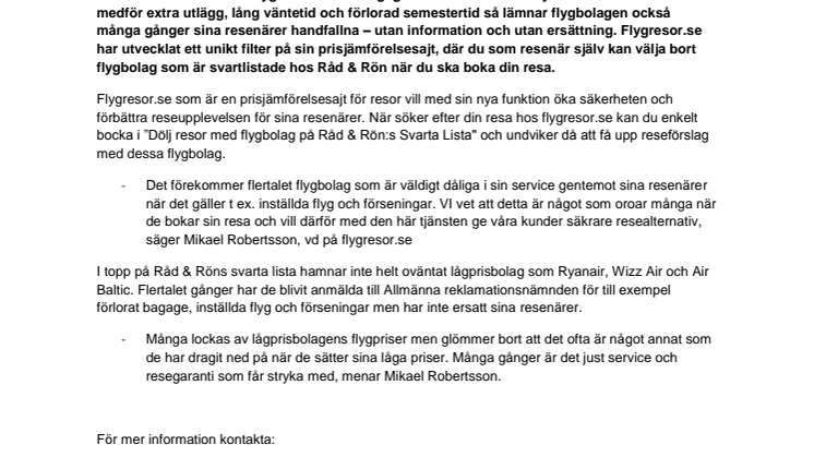 Flygresor.se som är en prisjämförelsesajt för resor vill med sin nya funktion öka säkerheten och förbättra reseupplevelsen för sina resenärer. När söker efter din resa hos flygresor.se kan du enkelt bocka i ”Dölj resor med flygbolag på Råd & Rön:s Svarta Lista" och undviker då att få upp reseförslag med dessa flygbolag.