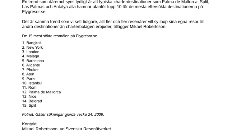 En trend som däremot syns tydligt är att typiska charterdestinationer som Palma de Mallorca, Split, Las Palmas och Antalya alla hamnar utanför topp 10 för de mesta eftersökta destinationerna på Flygresor.se