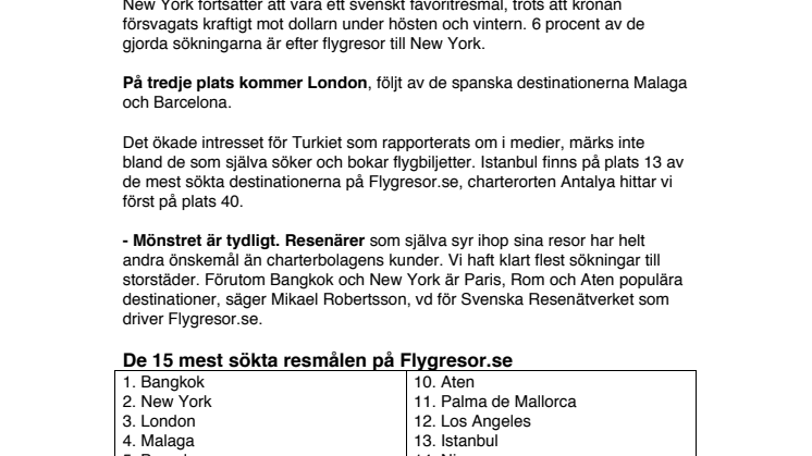 - Mönstret är tydligt. Resenärer som själva syr ihop sina resor har helt andra önskemål än charterbolagens kunder. Vi haft klart flest sökningar till storstäder. Förutom Bangkok och New York är Paris, Rom och Aten populära destinationer, säger Mikael Robertsson, vd för Svenska Resenätverket som driver Flygresor.se.