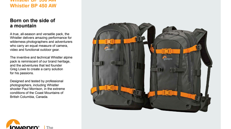 ”Jag har arbetat med Lowepro ända sedan jag började fotografera skidåkning för 35 år sedan, och det var en Lowepro ryggsäck som fick min utrustning att överleva en lavin 1997 ”, säger Paul Morrisson,”en kamera betyder olika saker för olika fotografer, men alla kan nog hålla med om att det är mer än ett verktyg, och väskan man bär sin utrustning i blir därför en viktig länk mellan människa och kamera. Det är sådana tankar som ligger bakom utvecklingen av Whistler”.