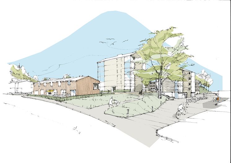 Skiss över Dotegården, sett från Almåsgången. Här är tanken att bygga nya flerfamiljshus och radhus utmed Sagbrovägen.