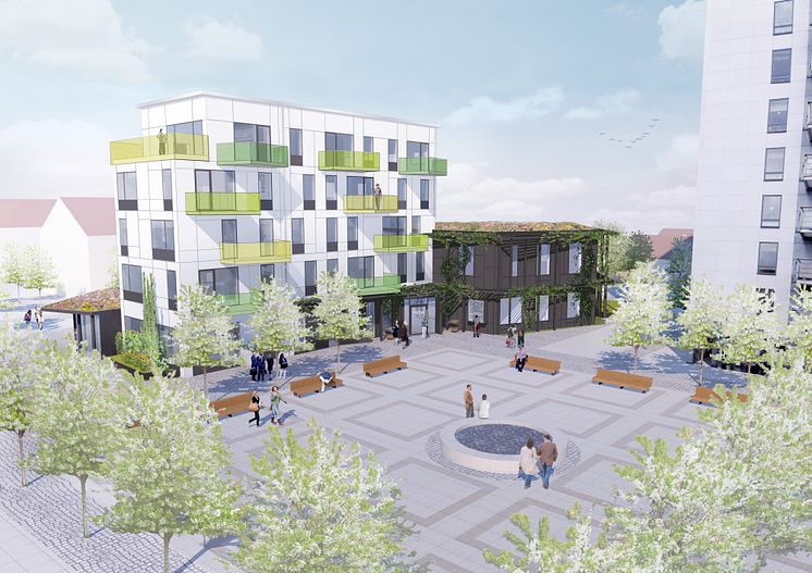 Det nya huvudkontoret ligger vid Råda Torg i Mölnlycke. Illustration: CNA Arkitekter